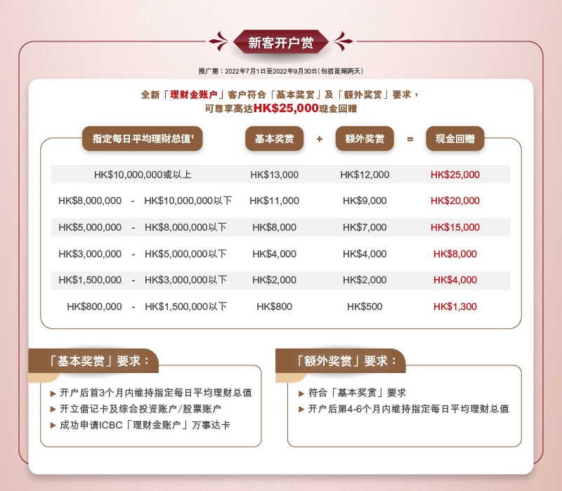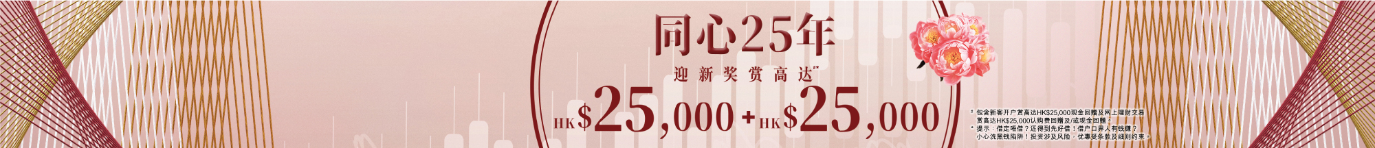 工银亚洲与您同心庆祝香港特别行政区成立25周年。全新理财金客户有机会尊享新客开户赏高达HK$25,000现金回赠及网上理财交易赏高达HK$25,000认购费回赠及/或现金回赠。
