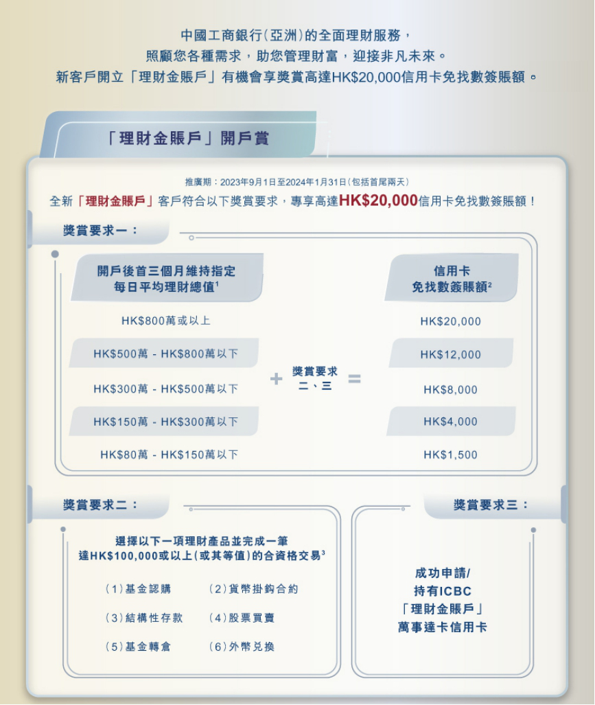 獎賞以ICBC「理財金賬戶」萬事達卡信用卡免找數簽賬額形式發放。