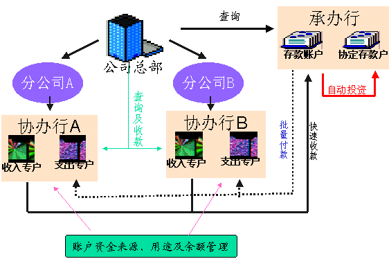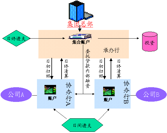 ●投资:对客户集中后的资金,日终将超过留存额度的资金转入协定存款户,次日营业开始再全部转回,提高存款收益。客户也可进行其他投资。